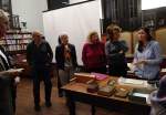 After summarizing her impressive past projects, “The Book Restorer” (as she is known) introduced her current work to restore or rehouse volumes from the library’s Adopt-a-Rare-Book program, and invited attendees forward to observe some common conservation treatments. Questions were answered with thoughtfulness throughout.