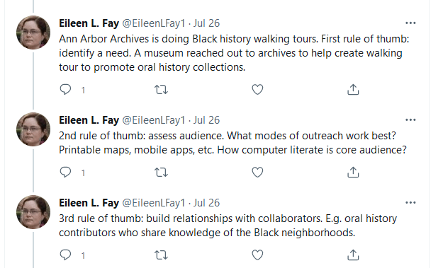 Two other presentations I found especially useful focused on walking tours as an example of the archives as a facilitator of community-led initiatives. Heidi Morse discussed The Living Oral History Project Walking Tour: Black Neighborhoods in Ann Arbor, which came about after the African-American Cultural and Historical Museum reached out to the Ann Arbor District Library Archives for assistance in promoting their oral history collections. Rachel Onuf praised the pandemic outreach efforts of the Norwich Historical Society & Community Center, which included three podcast driving tours on topics found to be of most interest to the community. These tours helped get people out of the house in a safe manner. The concept was recently expanded into the first-ever Feast from the Farms self-guided driving/bicycle tour of local working farms, which included a history podcast, pop-up exhibits, and the ability to purchase fresh ingredients for recommended recipes.