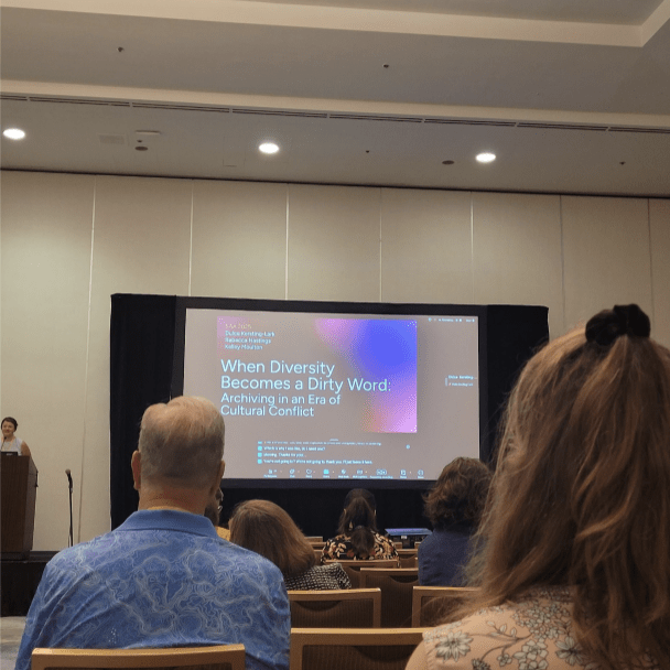 I decided I would try to attend as many sessions as possible that would not be recorded. This included ones with pretty sensitive subject matter such as the recent attacks on archives in the country over the past year. The attendees in these sessions were able to have open, honest, and productive conversations. It was really beneficial to speak with people from different types of institutions in different political climates and learn about how they’ve navigated through trials they’ve been faced with. I also attended the Diversity Forum, where my fellow attendees had conversations on how all of the changes in the field have affected them, whether they be early- career, mid-career, or late-career professionals. My biggest takeaway from these sessions and conversations was keeping the faith and knowing that we can weather this storm. There are still good things happening. People are receiving funding and community support in new ways, and I even feel like I was able to transition to a new role in the field quickly enough after moving thanks to my mentors and support system in the field. Overall, I learned so much and I have a new outlook on the future of archives and the archival community. I’m positive about where we’re headed, as long as we put in what we hope to get out.