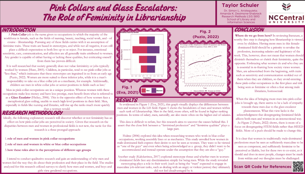 As found in the SAA program, Blue’s phenomenal poster “Pink Collars and Glass Escalators: The Role of Femininity in Librarianship” sought to: synthesize research around the topic of ‘pink collar’ jobs, a name given to occupations in which the majority of the workforce is female. The field of librarianship is heavily associated with women and seen in the public view as a woman’s career. This brings it’s own unique challenges for women and men who pursue a career in libraries or archives, including but not limited to how they are treated by their peers, supervisors, colleagues, and subordinates. Additionally, the ‘glass escalator’ phenomenon is explored, in which men in pink collar jobs rise the ranks more quickly than women do. The information science field being perceived as a feminine field while our country is based in a patriarchal hegemony, leads to information science professionals and their line of work as not being taken seriously by the general public. The research conducted for this poster seeks to answer questions on how these attitudes came to be and what we can do to move towards a legitimization of the field by being aware of these attitudes.